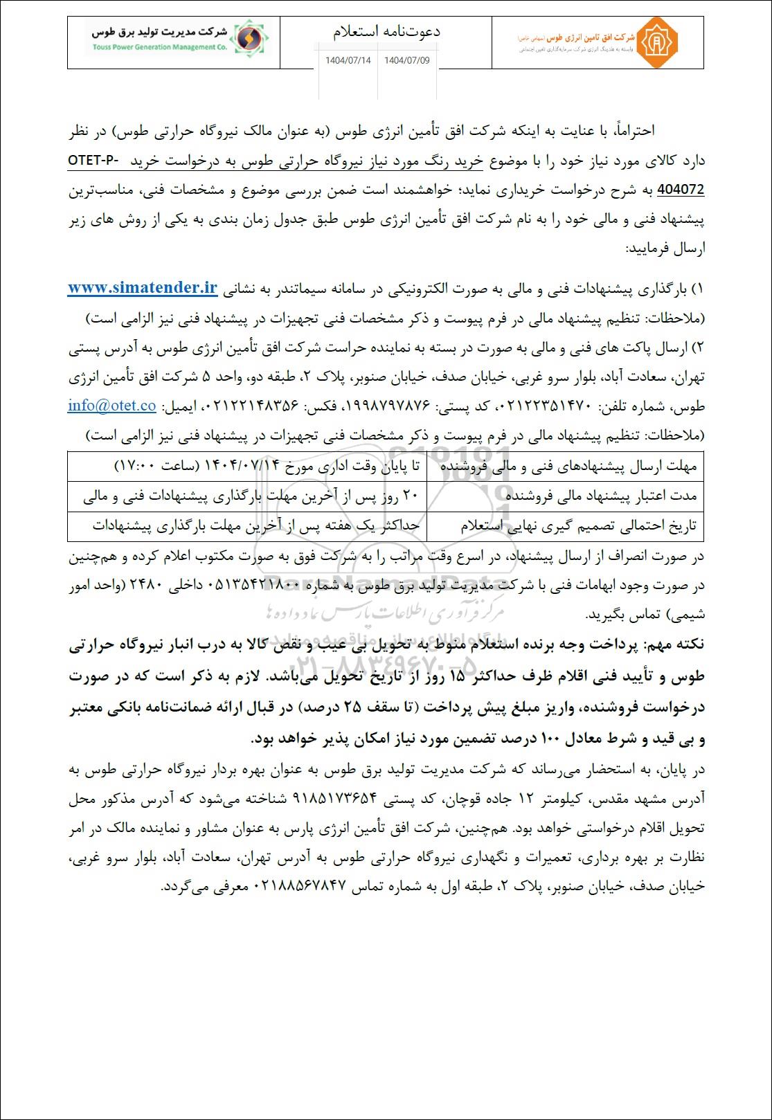 احتراماً با عنایت به اینکه شرکت افق تأمین انرژی طوس (به عنوان مالک نیروگاه حرارتی طوس) در نظر دارد کالای مورد نیاز خود را با موضوع خرید رنگ مورد نیاز نیروگاه حرارتی طوس به درخواست خرید OTET-P-404072 به شرح درخواست خریداری نماید .