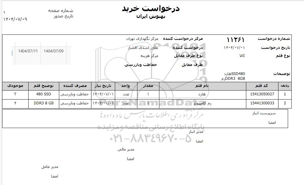 | 2 | 15441300033 | رم کامپیوتر | 1 | عدد | 1404.7.01 | حفاظت و بازرسی | DDR3 8GB | 4 |