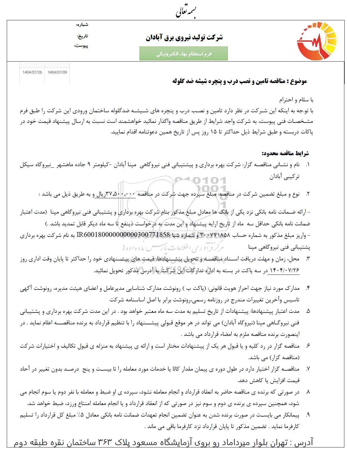 3. محل، زمان و مهلت دریافت اسناد مناقصه و تحویل پیشنهادها: قیمت های پیشنهادی خود را حداکثر تا پایان وقت اداری روز 1404.07.26 در سه پاکت در بسته به اداره تدارکات این شرکت به آدرس مذکور تحویل نمائید.