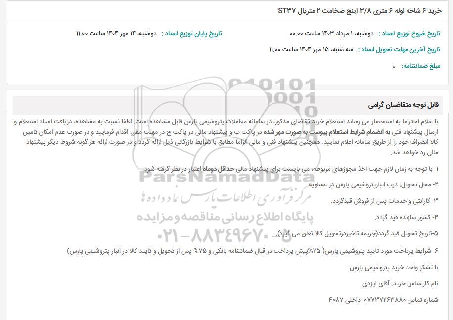 استعلام خرید 6 شاخه لوله 6 متری 3/8 اینچ ضخامت 2 متریال ST37, استعلام خرید 6 شاخه لوله 6 متری 3/8 اینچ ضخامت 2 متریال ST37