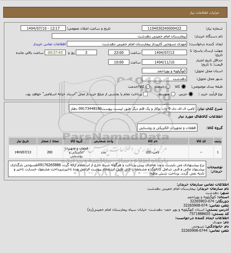 شرح کلی نیاز: لامپ ال ای دی 9 وات توکار و یک قلم دیگر طبق لیست پیوست09173448186 دهاز