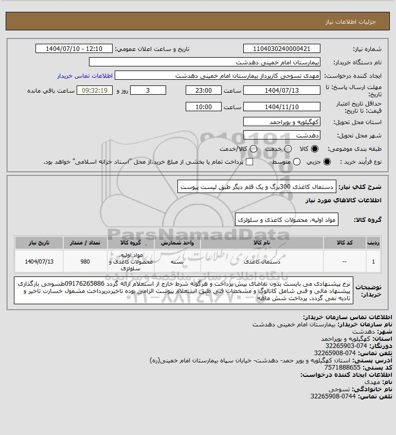 شرح کلی نیاز: دستمال کاغذی 300برگ و یک قلم دیگر طبق لیست پیوست