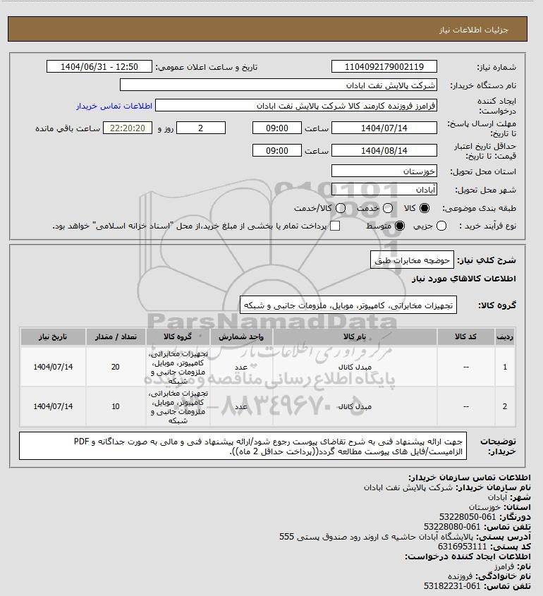 | 1 | -- | مبدل کانال | عدد | تجهیزات مخابراتی، کامپیوتر، موبایل، ملزومات جانبی و شبکه | 20 | 1404/07/14 |