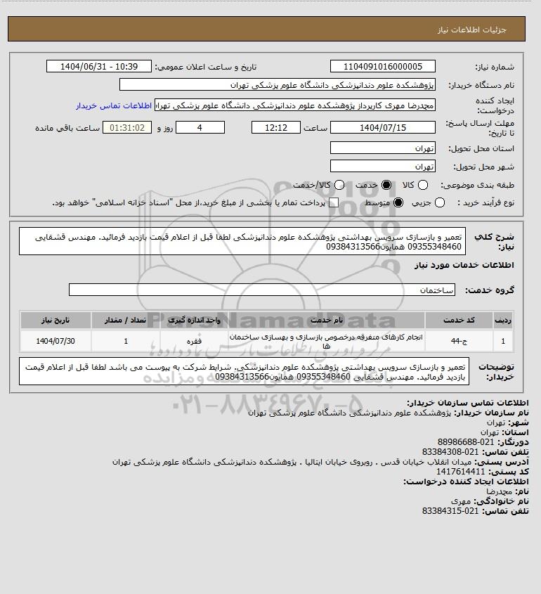 شرح کلی نیاز: تعمیر و بازسازی سرویس بهداشتی پژوهشکده علوم دندانپزشکی لطفا قبل از اعلام قیمت بازدید فرمائید. مهندس قشقایی 09355348460 همایون09384313566