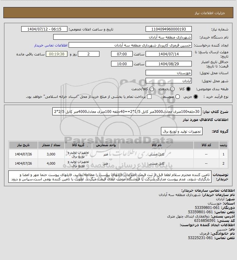 2 استعلام کابل طبق مشخصات پیوست 9642643 1404/07/12 new not special not payed خوزستان