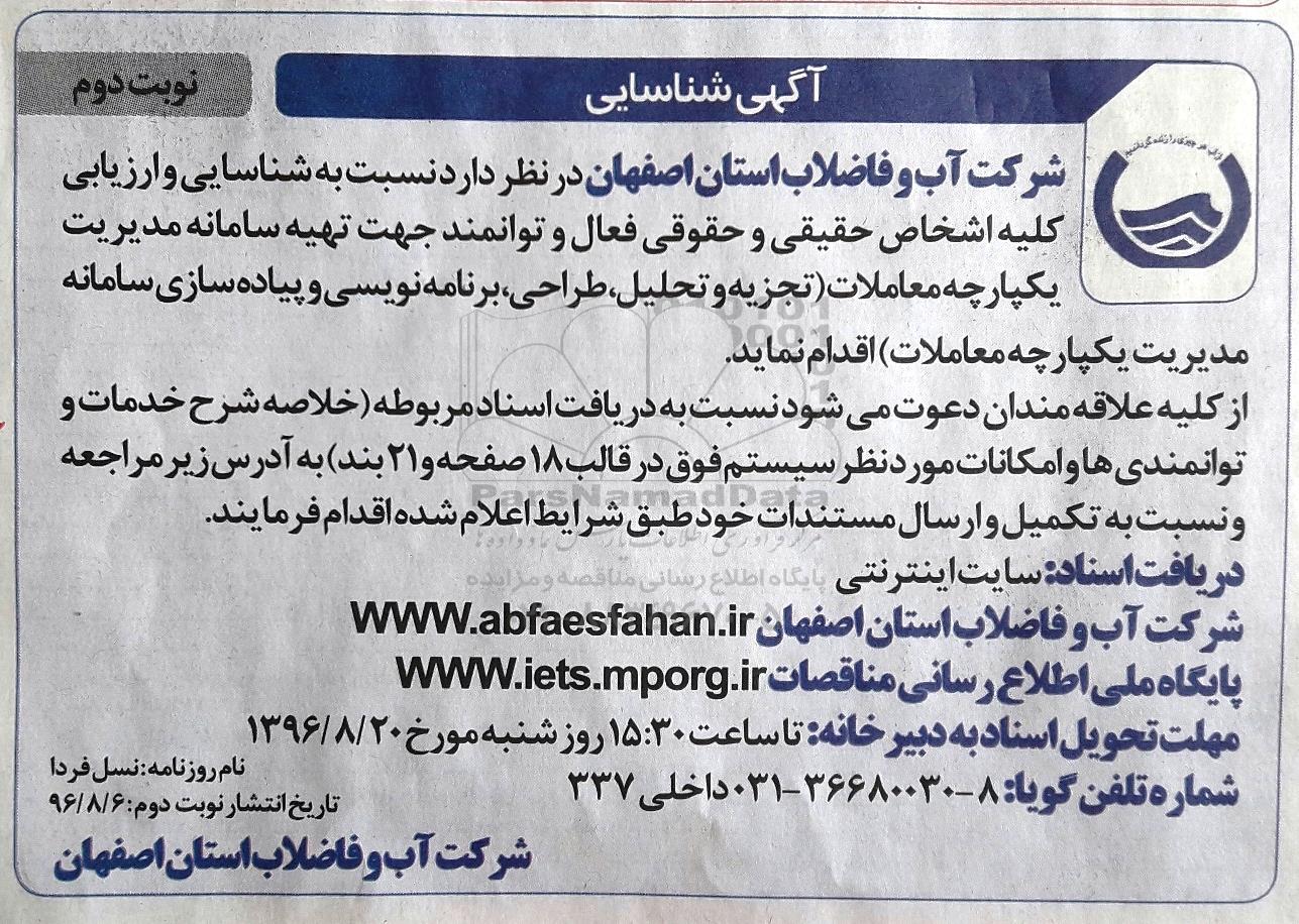 شرکت آب و فاضلاب استان اصفهان در نظر دارد نسبت به شناسایی و ارزیابی کلی اشخاص حقیقی و حقوقی فعال و توانمند جهت تهیه سامانه مدیریت یکپارچه معاملات (تجزیه و تحلیل، طراحی، برنامه نویسی و پیاده سازی سامانه مدیریت یکپارچه معاملات) اقدام نماید.