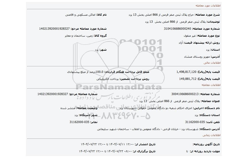 مزایده پلاک ثبتی صفر فرعی  از 866 اصلی بخش  13 یزد, مزایده، پلاک ثبتی صفر فرعی  از 866 اصلی بخش  13 یزد