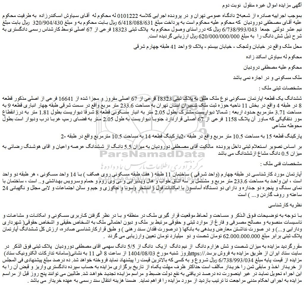 بموجب اجراییه صادره از شعبه2 دادگاه عمومی تهران و در پرونده اجرایی کلاسه 0101222 له محکوم له آقای سیاوش اسکندرزاده به طرفیت محکوم علیه آقای مصطفی دورودیان که محکوم علیه محکوم است به پرداخت مبلغ 6/418/088/631 ریال بابت محکوم به و مبلغ 320/904/430 ریال بابت مبلغ نیم عشر دولتی جمعا 6/738/993/043 ریال که درراستای وصول محکوم به پلاک ثبتی 18323 فرعی از 67 اصلی توسط کارشناس رسمی دادگستری به شرح ذیل شش دانگ را به مبلغ 620/000/000/000 ریال ارزیابی گردیده است.