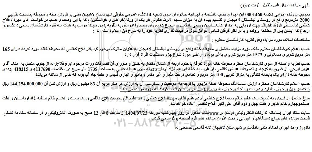بموجب پرونده اجرایی کلاسه 0001460 این اجرا و حسب دادنامه و اجرائیه صادره از سوی شعبه 4 دادگاه عمومی حقوقی شهرستان لاهیجان مبنی بر فروش خانه و محوطه بمساحت تقریبی 2000 مترمربع واقع در روستای لیالستان لاهیجان و تقسیم بهاء آن به میزان سهم الارث قانونی هر یک از ورثه(خواهان و خواندگان) ، که با این وصف و حسب در خواست آقای مهرداد فلاح کاظمی لیالستانی فرزند محمدباقر جهت ارزیابی به احد از کارشناسان رسمی دادگستری ارجاع که پس از وصول اعتراض به نظریه بدوی مجدداً مراتب به هیات سه نفره کارشناسان رسمی دادگستری ارجاع که ایشان پس از مطالعه پرونده و با در نظر گرفتن تمامی عوامل موثر در قیمت گذاری نظریه خود را به شرح ذیل اعلام داشته اند :