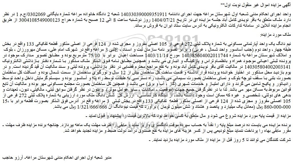 واحد اجرای احکام مدنی شعبه اول شهرستان مراغه جهت اجرای دادنامه 140330390009351911 شعبه 2 دادگاه خانواده مراغه شماره بایگانی 0302069/ج.م 1 در نظر دارد ملک متعلق به باقر نویدی کامل آباد جلسه مزایده ای در تاریخ 1404/07/21 روز دوشنبه ساعت 8 الی 12 صبح به شماره حراج 3004108549000123 از طریق انجام مزایده آنلاین در سامانه تدارکات الکترونیکی به آدرس سایت ستاد ایران به فروش برساند.