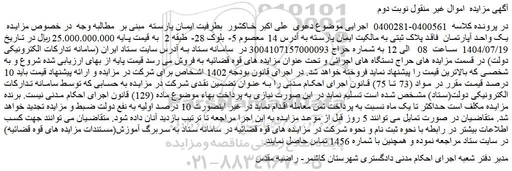 در پرونده کلاسه 0400281-0400561 اجرایی موضوع دعوی علی اکبر خاکشور بطرفیت ایمان پارسته مبنی بر مطالبه وجه در خصوص مزایده یک واحد آپارتمان فاقد پلاک ثبتی به مالکیت ایمان پارسته به آدرس 14 معصوم 5- بلوک 28- طبقه 2 به قیمت پایه 25.000.000.000 ریال در تاریخ 1404/07/19 ساعت 08 الی 12 به شماره حراج 3004107157000093 در سامانه ستاد به آدرس سایت ستاد ایران (سامانه تدارکات الکترونیکی دولت) در قسمت مزایده های حراج دستگاه های اجرائی و تحت عنوان مزایده های قوه قضائیه به فروش می رسد قیمت پایه از بهای ارزیابی شده شروع و به شخصی که بالاترین قیمت را پیشنهاد نماید فروخته خواهد شد. در اجرای قانون بودجه 1402 اشخاص برای شرکت در مزایده و ارائه پیشنهاد قیمت باید 10 درصد قیمت مقرر در مواد (73 تا 75) قانون اجرای احکام مدنی را به عنوان تضمین نقدی شرکت در مزایده به حسابی که توسط سامانه تدارکات الکترونیکی دولت(ستاد) مشخص شده است تسلیم نماید در این صورت نیازی به پرداخت بهاء موضوع ماده (129) قانون اجرای احکام مدنی نیست. برنده مزایده مکلف است حداکثر تا یک ماه نسبت به پرداخت ثمن معامله اقدام نماید در غیر اینصورت 10 درصد اولیه به نفع دولت ضبط و مزایده تجدید خواهد شد. متقاضیان در صورت تمایل می توانند 5 روز قبل از موعد مزایده به این اجرا مراجعه تا ترتیب بازدید آنان داده شود. متقاضیان می توانند جهت کسب اطلاعات بیشتر در رابطه با نحوه ثبت نام و نحوه شرکت در مزایده های قوه قضائیه در سامانه ستاد به سربرگ آموزش(مستندات مزایده های قوه قضائیه) در سایت ستاد مراجعه نموده و همچنین با شماره 1456 تماس حاصل نمایند.