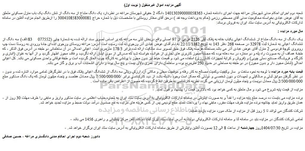 شعبه دوم اجرای احکام مدنی شهرستان مراغه جهت اجرای دادنامه شماره 140130390000058363 دادگاه 2 حقوقی شهرستان مراغه در نظردارد یک دانگ مشاع از سه دانگ از شش دانگ یک باب منزل مسکونی متعلق به آقای عوض عبادی بخواسته محکومیت مدنی آقای مصطفی رزمی (حکم به پرداخت وجه نقد ) درحق آقای مختار روستایی با مشخصات ذیل با شماره حراج 3004108583000081 را ازطریق انجام مزایده آنلاین در سامانه تدارکات الکترونیکی به آدرس سایت ستاد ایران به فروش برساند: