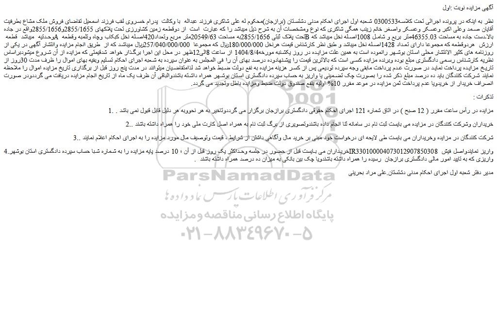 نظر به اینکه در پرونده اجرائی تحت کلاسه0300533 شعبه اول اجرای احکام مدنی دشتستان (برازجان)محکوم له علی شاکری فرزند عبداله با وکالت پدرام خسروی لقب فرزند اسمعیل تقاضای فروش ملک مشاع بطرفیت آقایان صمد وعلی اکبر وعسکر وعسکر واصغر خانم زینب همگی شاکری که نوع ومشخصات آن به شرح ذیل میباشد را که عبارت است از دوقطعه زمین کشاورزی تحت پلاکهای 2855/1655و2855/1656واقع در جاده وحدتیه میباشد قطعه aتحت پلاک ثبتی 2855/1656به مساحت 20549/63متر مربع وتعداد420اصله نخل کبکاب وچاه وتلمبه وقطعه b بالادست جاده به مساحت 46355.03متر بربع و شامل 1008اصله نخل میباشد که ارزش هردوقطعه که مجموعا دارای تعداد 1428اصله نخل میباشد و طبق نظر کارشناس قیمت هرنخل 180/000/000ریال که مجموعا 257/040/000/000ریال میباشد که از طریق انجام مزایده وانتشار آگهی در یکی از روزنامه های کثیر الانتشار محلی استان بوشهر رانموده است به همین علت مزایده در روز یکشنبه مورخه1404/8/4 از ساعت 8الی12ظهر در محل این اجرا برگذار خواهد شدقیمتی که مزایده از آن شروع میشودبراساس نظریه کارشناس رسمی دادگستری مبلغ بوده وبرنده مزایده کسی است که بالاترین قیمت را پیشنهادوده درصد بهای آن را فی المجلس به عنوان سپرده به شعبه اجرای احکام تسلیم وبقیه بهای اموال را ظرف مدت 30روز از تاریخ مزایده پرداخت نماید در صورت عدم پرداخت مابقی وجه سپرده تودیعی پس از کسر هزینه مزایده به نفع دولت ضبط خواهد شد لذامتقاضیان میتوانند در مدت پنج روز قبل از برگذاری تاریخ مزایده اموال را ملاحظه نمایند شرکت کنندگان باید ده درصد مبلغ ذکر شده را بصورت چک تضمینی یا واریز به حساب سپرده دادگستری استان بوشهر همراه داشته باشندوالباقی آن ظرف یک ماه از تاریخ انجام مزایده دریافت می گرددودر صورت انصراف خریدار از خریدویا عدم پرداخت ثمن مزایده در موعد مقرر 10% اولیه بنفع صندوق دولت ضبط ومزایده باطل وتجدید می گردد.