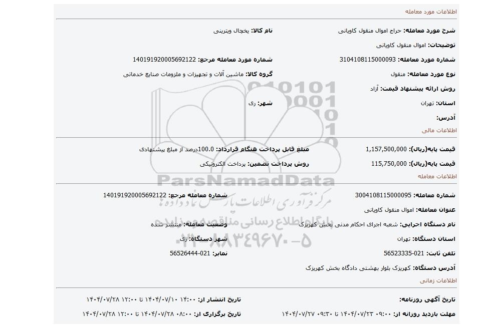 | شماره مورد معامله: 3104108115000093 | شماره مورد معامله مرجع: 140191920005692122 | |
