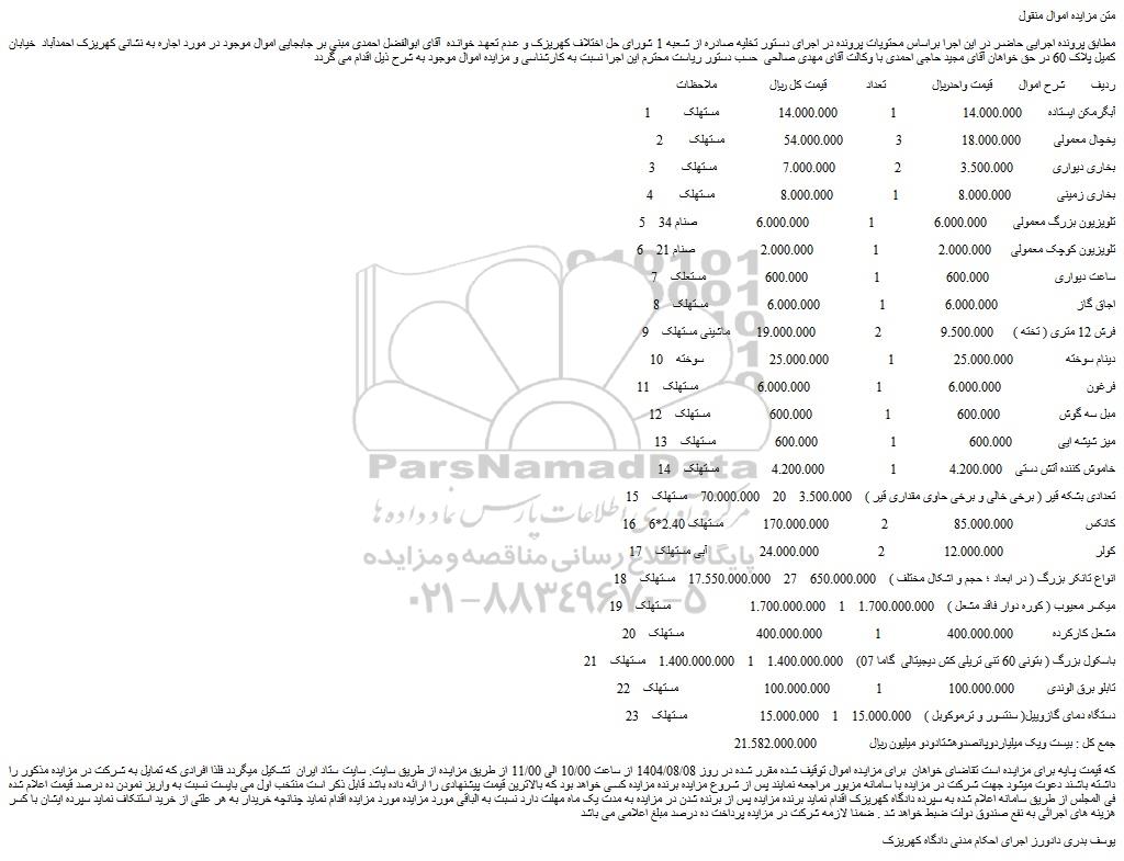 مطابق پرونده اجرایی حاضر در این اجرا براساس محتویات پرونده در اجرای دستور تخلیه صادره از شعبه 1 شورای حل اختلاف کهریزک و عدم تعهد خوانده آقای ابوالفضل احمدی مبنی بر جابجایی اموال موجود در مورد اجاره به نشانی کهریزک احمدآباد خیابان کمیل پلاک 60 در حق خواهان آقای مجید حاجی احمدی با وکالت آقای مهدی صالحی حسب دستور ریاست محترم این اجرا نسبت به کارشناسی و مزایده اموال موجود به شرح ذیل اقدام می گردد