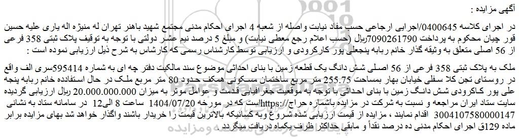 ملک به پلاک ثبتی 358 فرعی از 56 اصلی شش دانگ یک قطعه زمین با بنای احداثی موضوع سند مالکیت دفتر چه ای به شماره 595414سری الف واقع در روستای تجن کلا سفلی خیابان بهار بمساحت 255.75 متر مربع ساختمان مسکونی همکف حدود 80 متر مربع ملک در حال استفادده خانم ربابه پنجه علی پور کاکرودی شش دانگ زمین با بنای احداثی با توجه به موقعیت جغرافیایی قدمت و عوامل موثر به میزان 20.000.000.000 ریال ارزیابی گردیده است که در مورخه 1404/07/20 ساعت 8 الی12 در سامانه ستاد به نشانی سایت ستاد ایران مراجعه و نسبت به شرکت در مزایده باشماره حراج 3004107580000147 اقدام نمایند ، مزایده از قیمت ارزیابی شده شروع وبه کسانیکه بالاترین قیمت را خریدار باشند واگذار خواهد شد بهای مزایده برابر ماده 129ق اجرای احکام مدنی ده درصد نقداً و مابقی حداکثر ظرف یکماه دریافت میگردد .