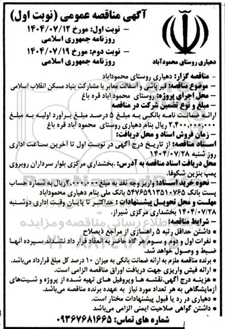 ارائه ضمانت نامه بانکی به مبلغ 5 درصد مبلغ برآورد اولیه به مبلغ 2.400.000.000 ریال بنام دهیاری روستای محمود آباد قره باغ