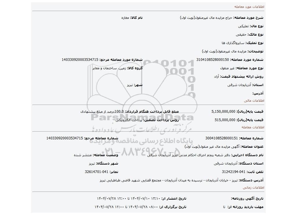 | شرح مورد معامله: حراج مزایده مال غیرمنقول(نوبت اول) | نام کالا: مغازه | |