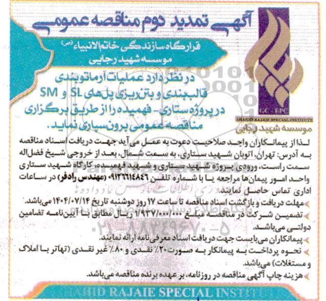 قرارگاه سازندگی خاتم الانبیاء (ص) موسسه شهید رجایی در نظر دارد عملیات آرماتوربندی، قالب بندی و بتن ریزی پل های SL و SM در پروژه ستاری - فهمیده را از طریق برگزاری مناقصه عمومی برون سپاری نماید. لذا از پیمانکاران واجد صلاحیت دعوت به عمل می آید جهت دریافت اسناد مناقصه به آدرس تهران - اتوبان شهید ستاری به سمت شمال - بعد از خروجی شیخ فضل اله - سمت راست - ورودی پروژه شهید ستاری و شهید فهمیده - کارگاه شهید ستاری واحد امور پیمانها مراجعه یا با شماره تلفن 09126614846 (مهندس رادفر) در ساعات اداری تماس حاصل نمایند.