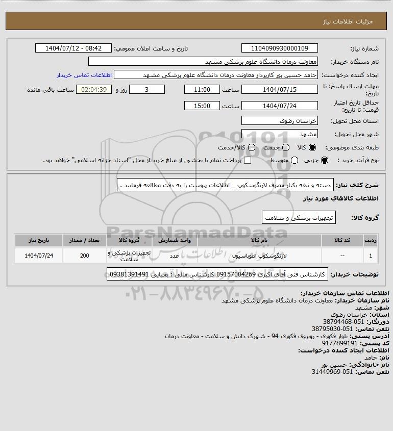 نام دستگاه خریدار:معاونت درمان دانشگاه علوم پزشکی مشهد