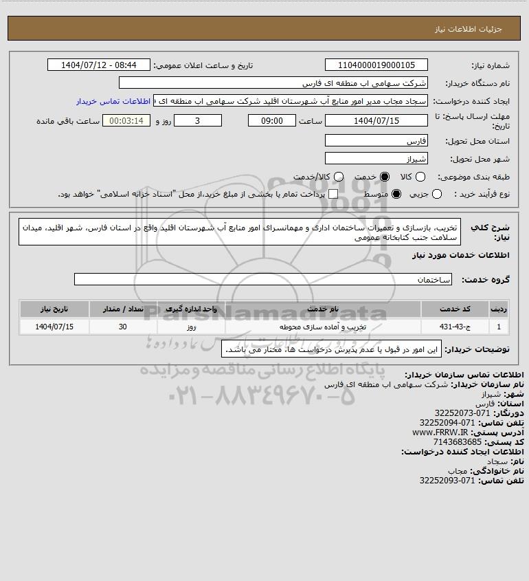 شرح کلی نیاز: تخریب، بازسازی و تعمیرات ساختمان اداری و مهمانسرای امور منابع آب شهرستان اقلید واقع در استان فارس، شهر اقلید، میدان سلامت جنب کتابخانه عمومی