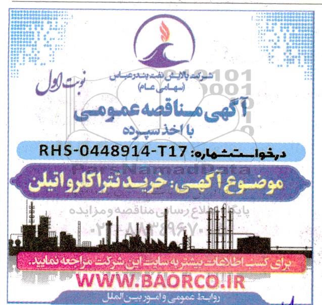 مناقصه خرید تترا کلرواتیلن از کلیه افراد متخصص و شرکتها واجد شرایط دعوت به عمل میآید در مناقصه با کد خبرگزاری پارس نماد: 9638195 شرکت نمایند.