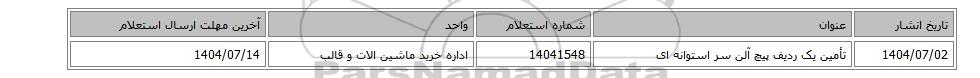 | 1404/07/02 | تأمین یک ردیف پیچ آلن سر استوانه ای | 14041548 | اداره خرید ماشین الات و قالب | 1404/07/14 |