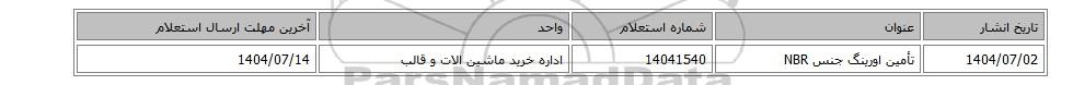 | 1404/07/02 | تأمین اورینگ جنس NBR | 14041540 | اداره خرید ماشین الات و قالب | 1404/07/14 |