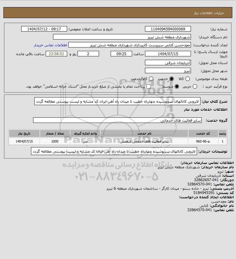 شرح کلی نیاز: لایروبی کانالهای سرپوشیده چهارراه خطیب تا میدان راه آهن-ایران کد مشابه و لیست پیوستی مطالعه گردد