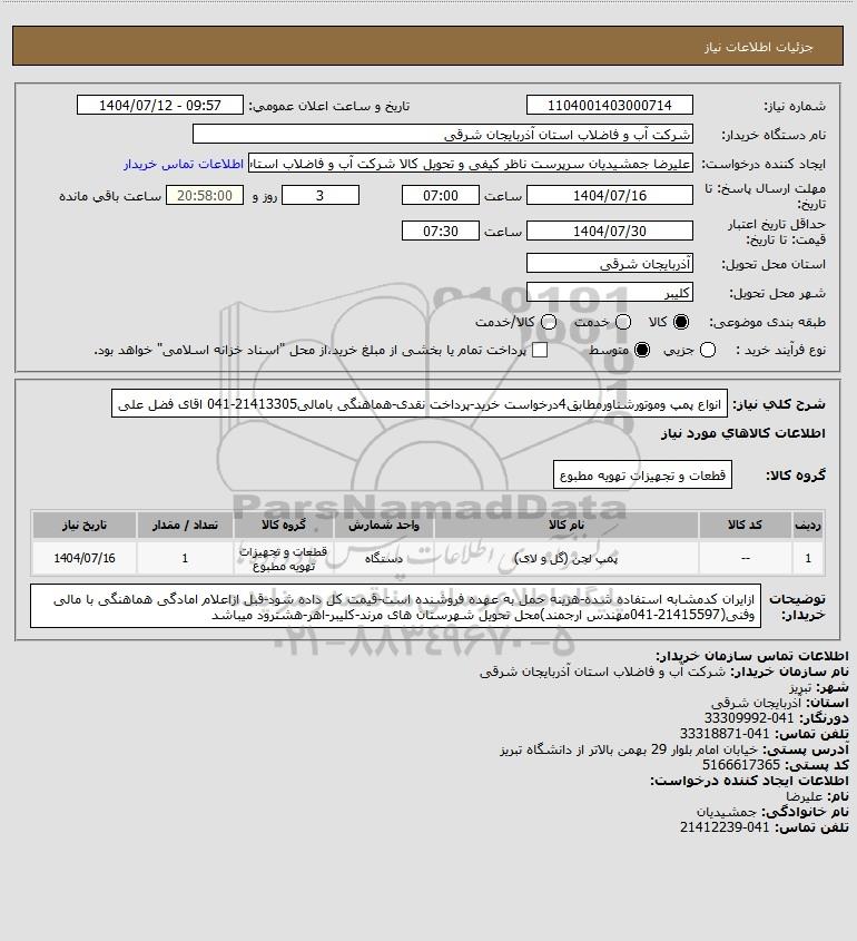 شرح کلی نیاز: انواع پمپ وموتورشناورمطابق4درخواست خرید-پرداخت نقدی-هماهنگی بامالی21413305-041 اقای فضل علی