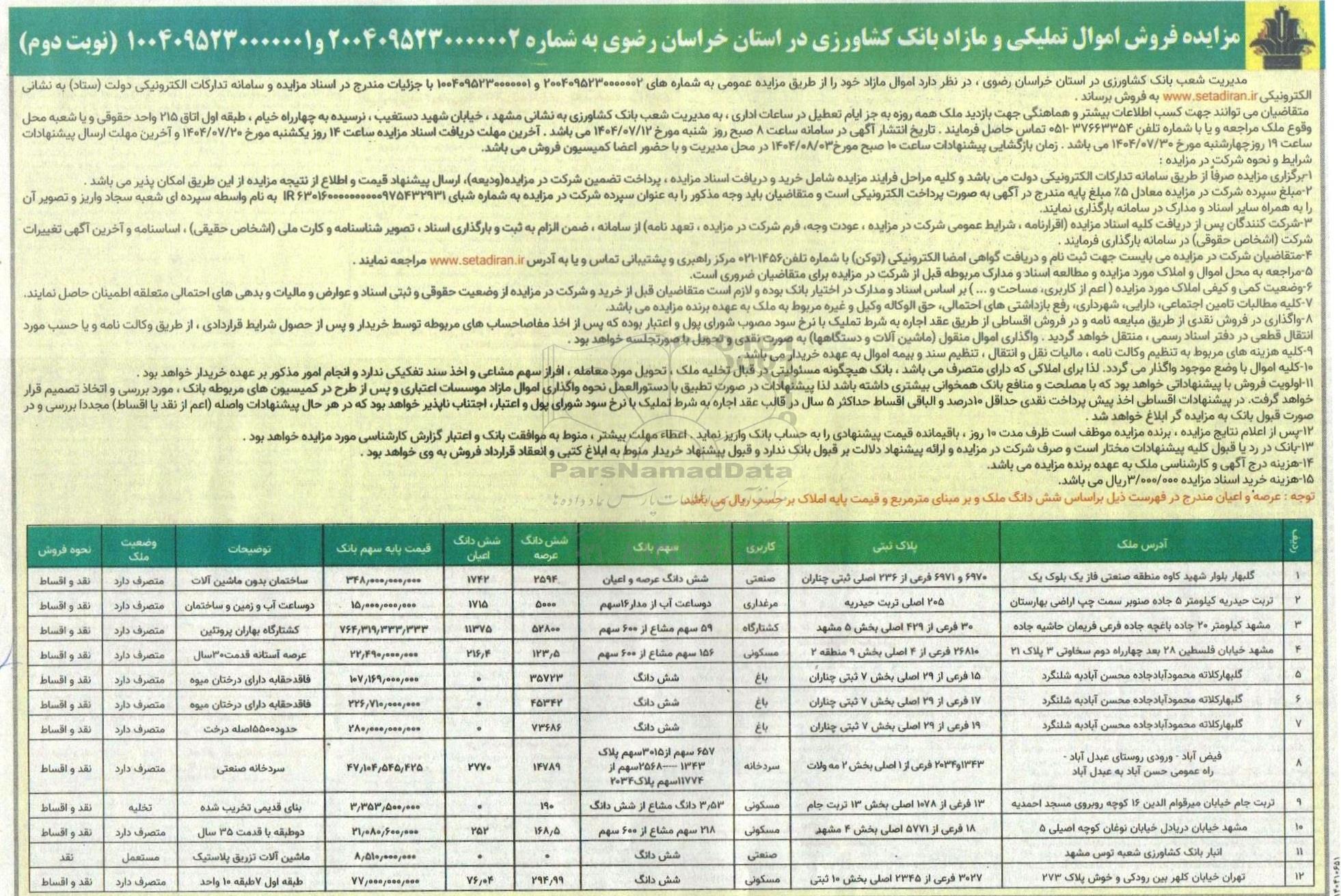 مزایده فروش اموال تملیکی و مازاد بانک کشاورزی در استان خراسان رضوی به شماره 2004095230000002 و 1004095230000001 نوبت دوم