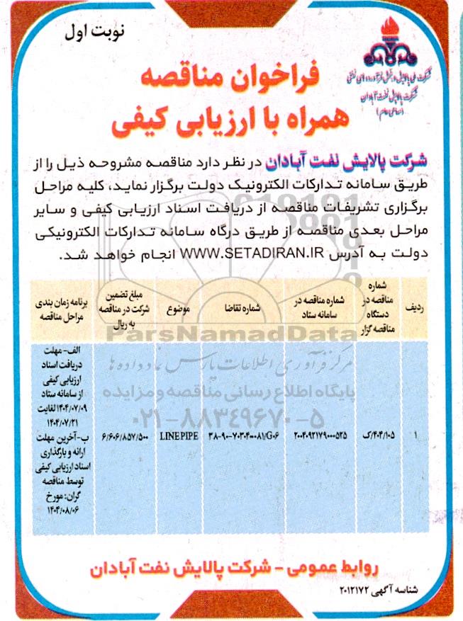 علاقهمندان میتوانند جهت دریافت اسناد و اطلاعات تکمیلی، فراخوان مناقصه LINE PIPE با سامانه مناقصات و مزایدات ایران پارسنماد داده ها 88349670 تماس حاصل نمایند.