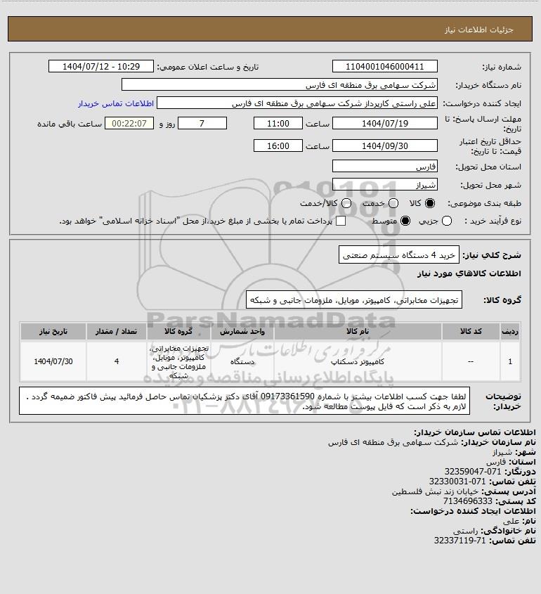 نام دستگاه خریدار:شرکت سهامی برق منطقه ای فارس