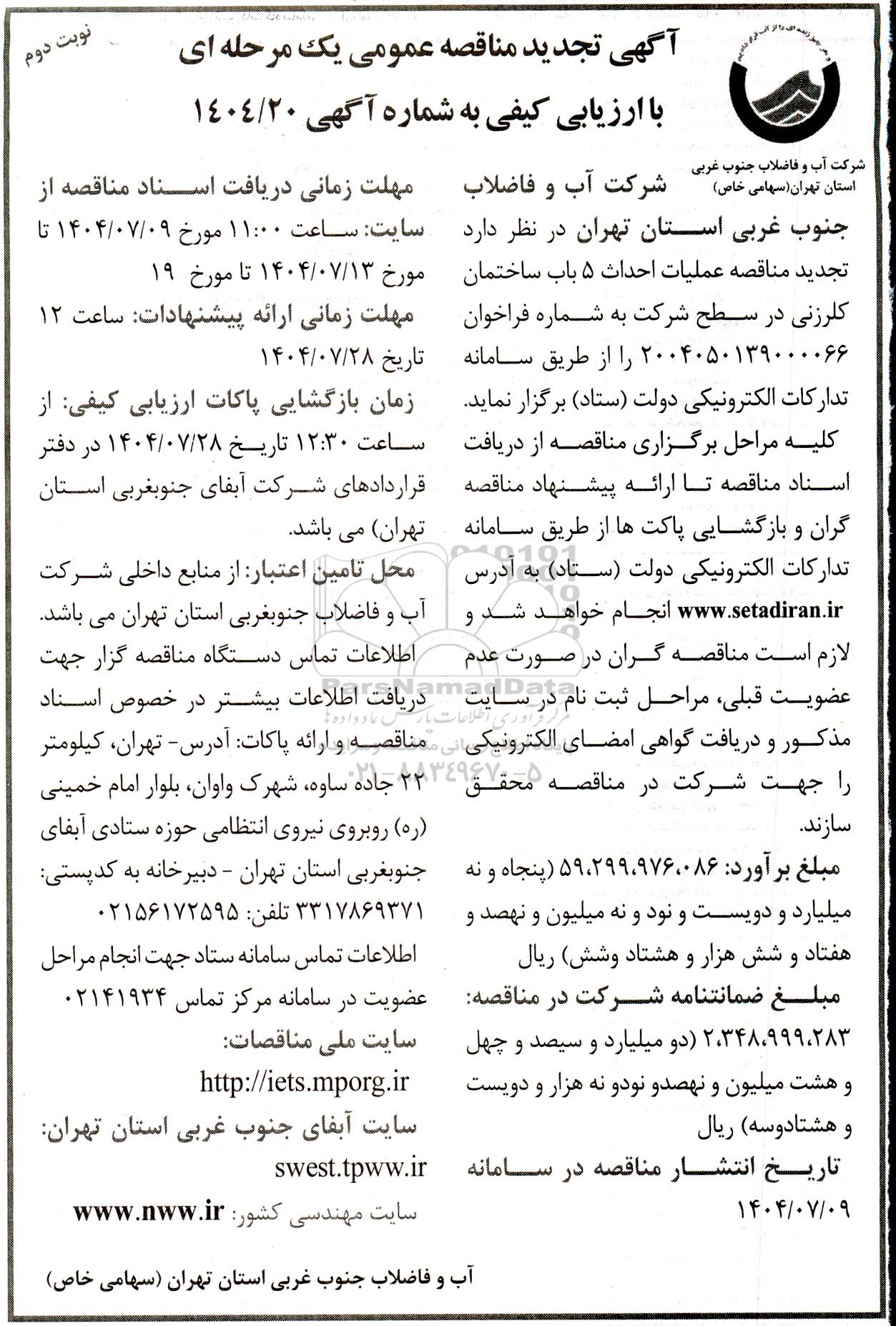 شرکت آب و فاضلاب جنوبغربی استان تهران در نظر دارد تجدید مناقصه عملیات احداث 5 باب ساختمان کلرزنی در سطح شرکت به شماره فراخوان 2004050139000066 را از طریق سامانه تدارکات الکترونیکی دولت (ستاد) برگزار نماید. کلیه مراحل برگزاری مناقصه از دریافت اسناد مناقصه تا ارائه پیشنهاد مناقصه گران و بازگشایی پاکت ها از طریق سامانه تدارکات الکترونیکی دولت (ستاد) به آدرس سایت ستاد ایران انجام خواهد شد و لازم است مناقصه گران در صورت عدم عضویت قبلی، مراحل ثبت نام در سایت مذکور و دریافت گواهی امضا الکترونیکی را جهت شرکت در مناقصه محقق سازند.