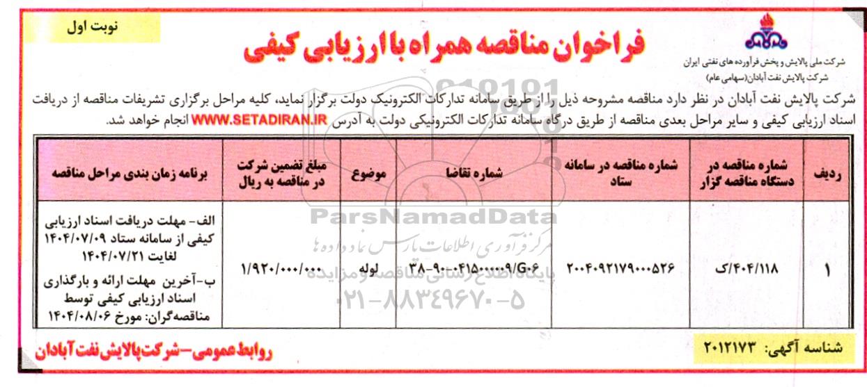 | 1 | ک/404/118 | 2004092179000526 | 38-90-0415000009/G06 | لوله | 1.920.000.000 | الف- مهلت دریافت اسناد ارزیابی کیفی از سامانه ستاد از 1404.07.09 لغایت 1404.07.21 ب- آخرین مهلت ارائه و بارگذاری اسناد ارزیابی کیفی توسط مناقصه گران مورخ 1404.08.06 |