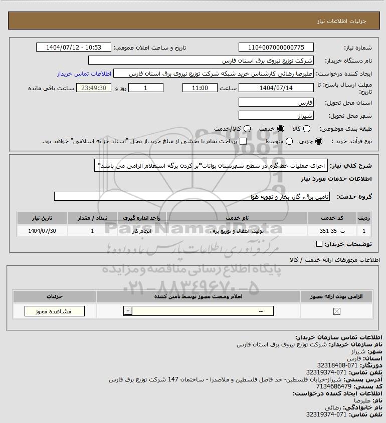 شرح کلی نیاز: اجرای عملیات خط گرم در سطح شهرستان بوانات*پر کردن برگه استعلام الزامی می باشد*