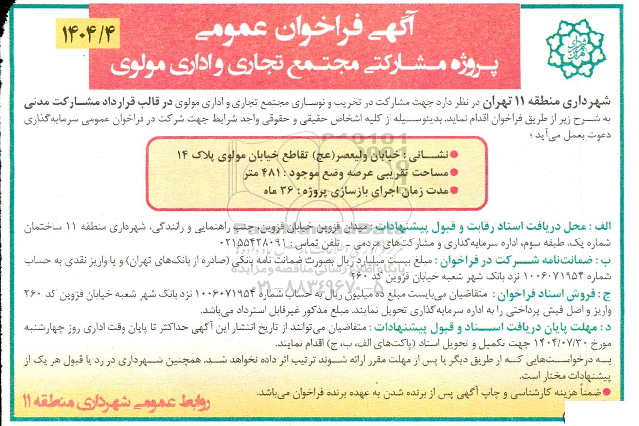 آگهی فراخوان عمومی پروژه مشارکتی مجتمع تجاری و اداری مولوی 1404/4