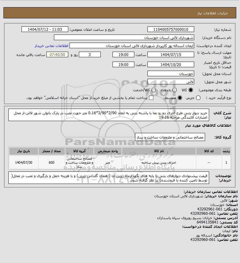 شرح کلی نیاز: خرید دیوار بتنی طرح آجری دو رو نما با پاشنه بتنی به ابعاد 2/90*2/90*0.16 متر جهت نصب در پارک بانولن شهر لالی-ار محل اعتبارات آلایندگی مرحله 16-19
