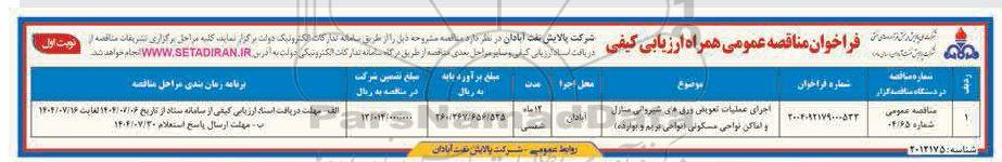 | 1 | مناقصه عمومی شماره 04.65 | 2004092179000533 | اجرای عملیات تعویض ورق های شیروانی منازل و اماکن نواحی مسکونی (نواحی بریم و بوارده) | آبادان | 12 ماه شمسی | 260.267.656.525 | 13.014.000.000 | الف- مهلت دریافت اسناد ارزیابی کیفی از سامانه ستاد از 1404.07.6 لغایت 1404.07.16 ب- مهلت ارسال پاسخ استعلام 1404.7.30 |