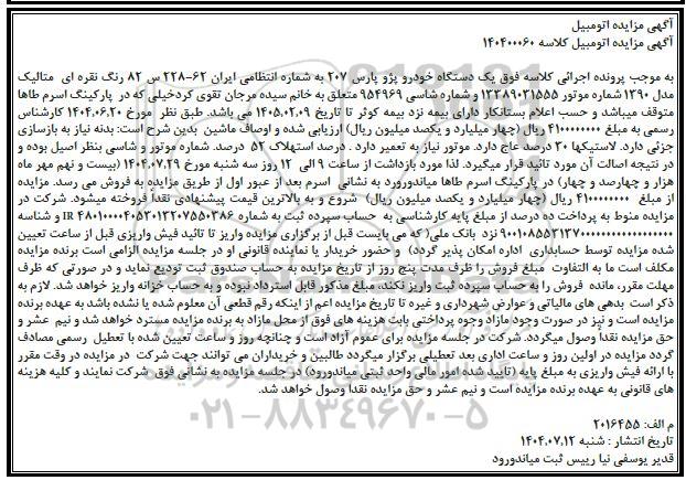 به موجب پرونده اجرائی کلاسه فوق یک دستگاه خودرو پژو پارس 207 به شماره انتظامی ایران 62-228 س 82 رنگ نقره ای متالیک مدل 1390 شماره موتور 13389031555 و شماره شاسی 954969 متعلق به خانم سیده مرجان تقوی کرد خیلی که در پارکینگ اسرم طاها متوقف میباشد و حسب اعلام بستانکار دارای بیمه نزد بیمه کوثر تا تاریخ 1405,02,09 میباشد. طبق نظر مورخ 1404,06,20 کارشناس رسمی به مبلغ 4100000000 ریال چهار میلیارد و یکصد میلیون ریال ارزیابی شده و اوصاف ماشین بدین شرح است بدنه نیاز به بازسازی جزئی دارد. لاستیکها 30 درصد عاج دارد موتور نیاز به تعمیر دارد . درصد استهلاک 52 درصد شماره موتور و شاسی بنظر اصیل بوده و در نتیجه اصالت آن مورد تائید قرار میگیرد. لذا مورد بازداشت از ساعت 9 الی 12 روز سه شنبه مورخ 1404,07,29 بیست و نهم مهر ماه هزار و چهارصد و چهار در پارکینگ اسرم طاها میاندورورد به نشانی اسرم بعد از عبور اول از طریق مزایده به فروش می رسد. مزایده از مبلغ 4100000000 ریال چهار میلیارد و یکصد میلیون ریال شروع و به بالاترین قیمت پیشنهادی نقدا فروخته میشود. شرکت در مزایده منوط به پرداخت ده درصد از مبلغ پایه کارشناسی به حساب سپرده ثبت به شماره 480100004053013207550386 IR و شناسه 90010855313700 نزد بانک ملی که می بایست قبل از برگزاری مزایده واریز تا تائید فیش واریزی قبل از ساعت تعیین شده مزایده توسط حسابداری اداره امکان پذیر گردد و حضور خریدار یا نماینده قانونی او در جلسه مزایده الزامی است برنده مزایده مکلف است ما به التفاوت مبلغ فروش را ظرف مدت پنج روز از تاریخ مزایده به حساب صندوق ثبت تودیع نماید و در صورتی که ظرف مهلت مقرر مانده فروش را به حساب سپرده ثبت واریز نکند مبلغ مذکور قابل استرداد نبوده و به حساب خزانه واریز خواهد شد. لازم به ذکر است بدهیهای مالیاتی و عوارض شهرداری و غیره تا تاریخ مزایده اعم از اینکه رقم قطعی آن معلوم شده یا نشده باشد به عهده برنده مزایده است و نیز در صورت وجود مازاد وجوه پرداختی بابت هزینه های فوق از محل مازاد به برنده مزایده مسترد خواهد شد و نیم عشر و حق مزایده نقدا وصول میگردد. شرکت در جلسه مزایده برای عموم آزاد است و چنانچه روز و ساعت تعیین شده با تعطیل رسمی مصادف گردد مزایده در اولین روز و ساعت اداری بعد تعطیلی برگزار میگردد طالبین و خریداران میتوانند جهت شرکت در مزایده در وقت مقرر با ارائه فیش واریزی به مبلغ پایه تایید شده امور مالی واحد ثبتی میاندورود در جلسه مزایده به نشانی فوق شرکت نمایند و کلیه هزینه های قانونی به عهده برنده مزایده است و نیم عشر و حق مزایده نقدا وصول خواهد شد.