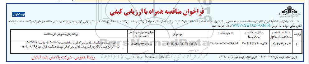 فراخوان مناقصه FURNACE TUBES از کلیه افراد متخصص و شرکتها واجد شرایط دعوت به عمل میآید در مناقصه با کد خبرگزاری پارس نماد: 9640327 شرکت نمایند.