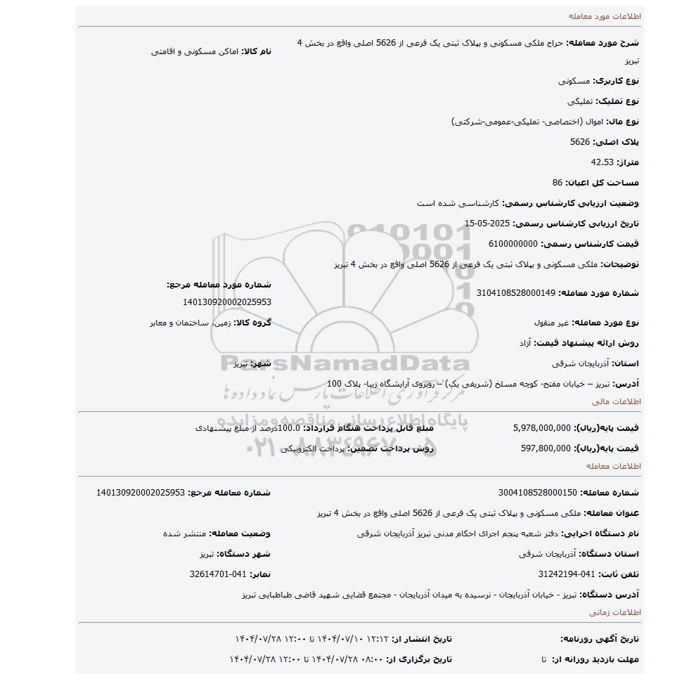 | شرح مورد معامله: حراج ملکی مسکونی و بپلاک ثبتی یک فرعی از 5626 اصلی واقع در بخش 4 تبریز | نام کالا: اماکن مسکونی و اقامتی | |