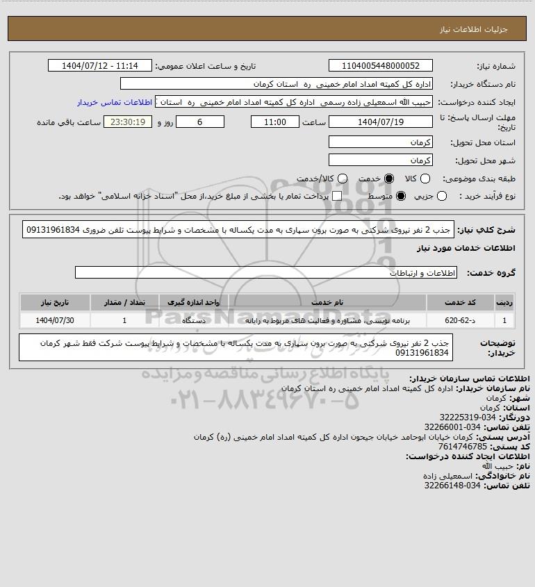 شرح کلی نیاز: جذب 2 نفر نیروی شرکتی به صورت برون سپاری به مدت یکساله با مشخصات و شرایط پیوست تلفن ضروری 09131961834