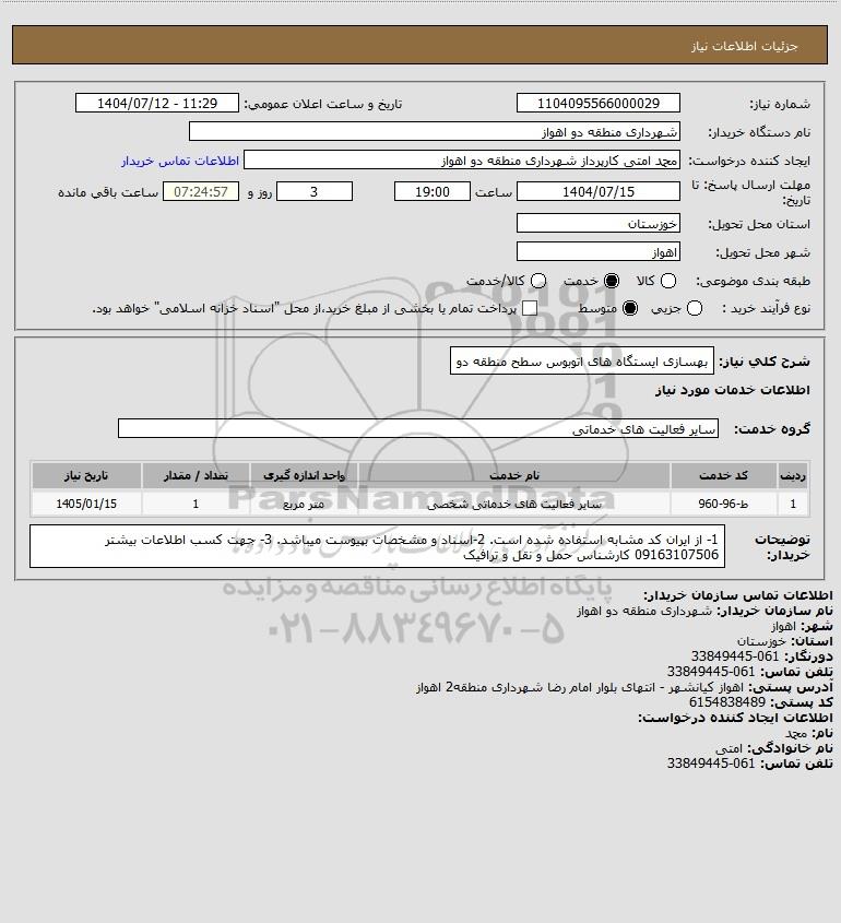 شرح کلی نیاز: بهسازی ایستگاه های اتوبوس سطح منطقه دو