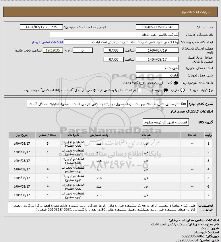 | 5 | -- | فن | عدد | قطعات و تجهیزات تهویه مطبوع | 4 | 1404/08/17 |