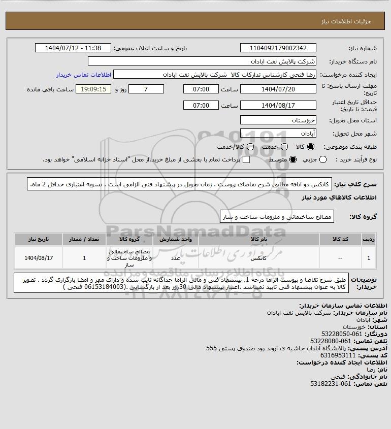 | 1 | -- | کانکس | عدد | مصالح ساختمانی و ملزومات ساخت و ساز | 1 | 1404/08/17 |
