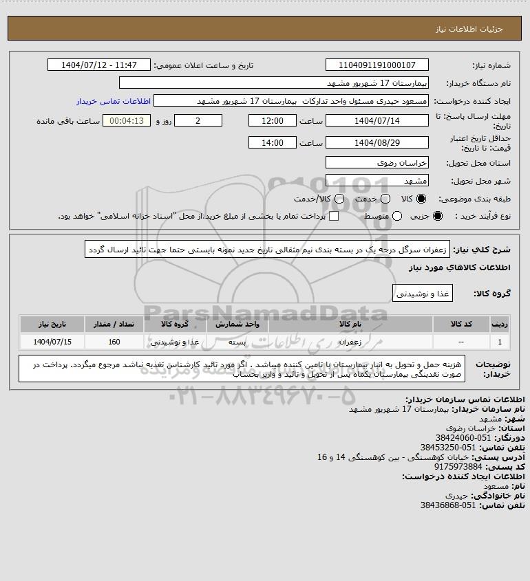 نام دستگاه خریدار:بیمارستان 17 شهریور مشهد