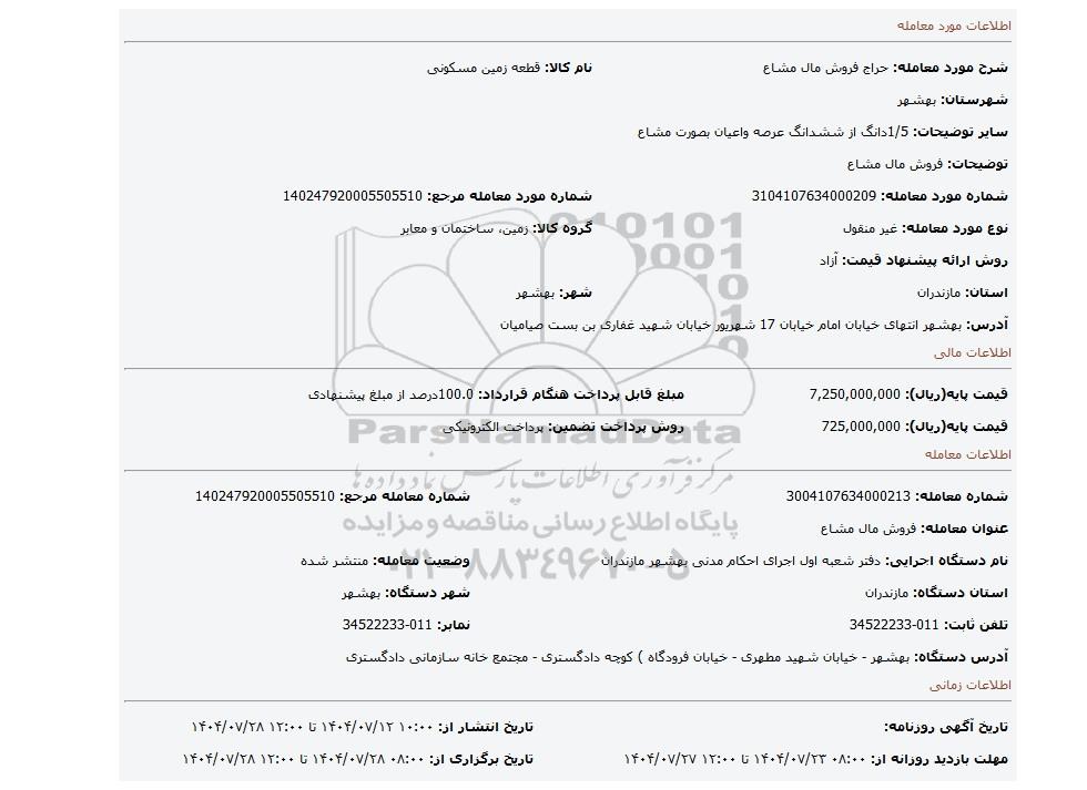 | شرح مورد معامله: حراج فروش مال مشاع | نام کالا: قطعه زمین مسکونی | |