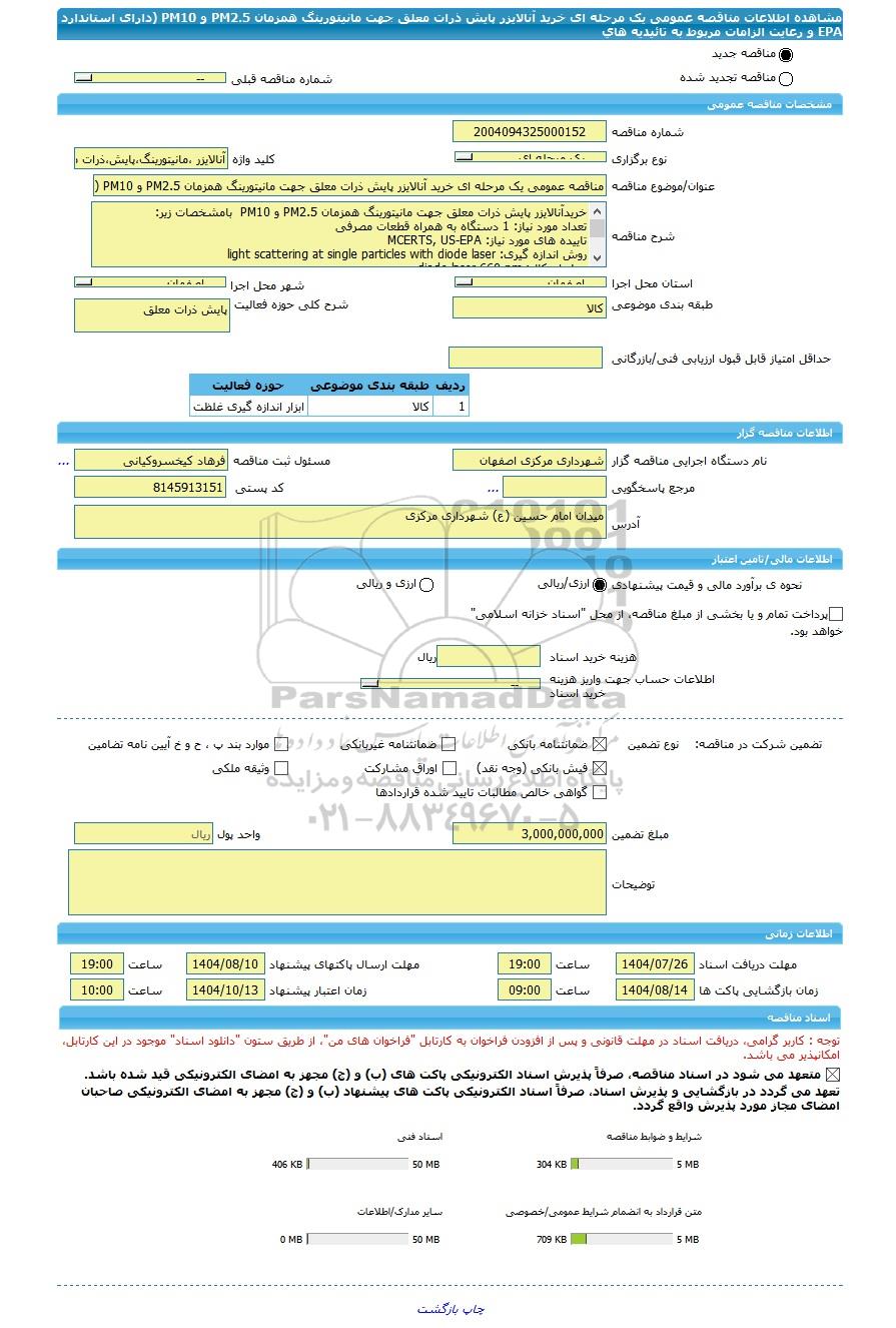 مناقصه مناقصه عمومی یک مرحله ای خرید آنالایزر پایش ذرات معلق جهت مانیتورینگ همزمان PM2.5 و PM10 (دارای استاندارد EPA و رعایت الزامات مربوط به تائیدیه های از کلیه افراد متخصص و شرکتها واجد شرایط دعوت به عمل میآید در مناقصه با کد خبرگزاری پارس نماد: 9640798 شرکت نمایند.