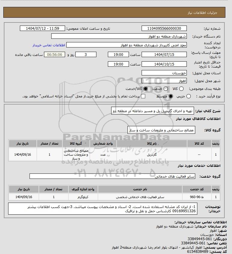 شرح کلی نیاز: تهیه و اجرای گاردریل پل و مسیر دغاغله در منطقه دو